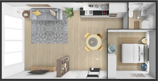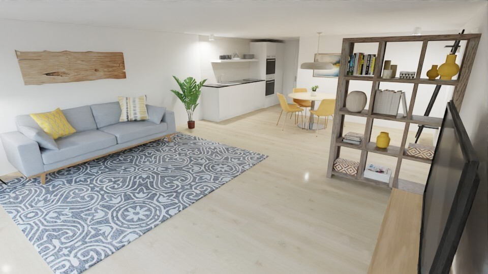 O quarto e a casa de banho com boas áreas garantem a privacidade e o sossego necessário para um descanso enquanto a sala aberta com kitchenette cria um espaço amplo e convidativo.